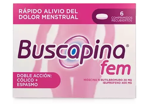 Buscapina® Fem actúa como antiespasmódico, analgésico y antiinflamatorio, ayudando a aliviar los dolores menstruales. La hioscina relaja los músculos de la zona genital, aliviando los cólicos. El ibuprofeno tiene un efecto analgésico y antiinflamatorio que alivia el dolor.